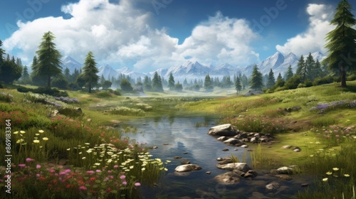 The image is a beautiful landscape of a mountain valley. The foreground is a lush green meadow, with a river running through it.