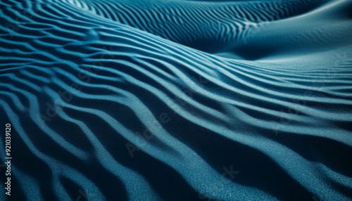 The image is of a blue ocean with a sandy beach. The water is calm and the sand is wet, creating a peaceful and serene atmosphere