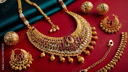 The image showcases a luxurious collection of traditional gold jewelry elegantly arranged on a dual-toned red and green fabric background. The collection includes a statement necklace featuring