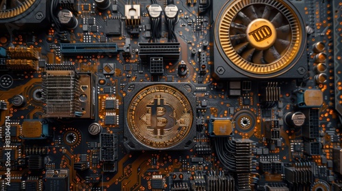 The image shows a close-up of a computer circuit board with a Bitcoin symbol in the center