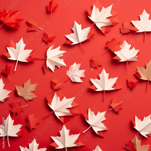 The image shows a collection of paper-crafted leaves in various shades of red and white, arranged on a red background. The leaves are intricately folded, giving them a three-dimensional appearance.