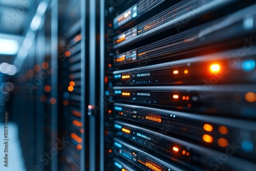The image shows a detailed view of bright, glowing LED lights on a server rack, representing advanced technology and data processing in a modern data center environment.