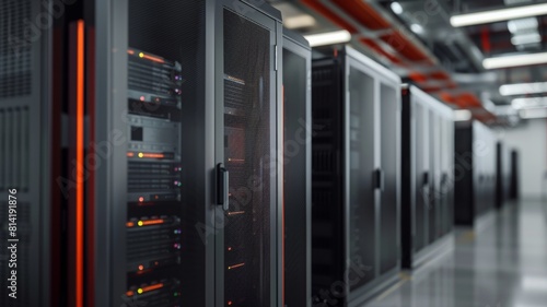 The image shows a modern data center with rows of server racks.