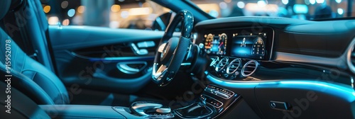 The interior of a luxury car is being meticulously cleaned and polished by a professional detailer with specialized tools in a well-lit workspace. Generative AI