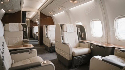 The interior of the airplane cabin, with tidy and orderly facilities such as seats, presents a comfortable air travel environment.