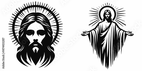 The Jesus with Halo. Christian Clipart silhouette Vector Logo Symbol isolated on white background. Divine messiah portrait holy aureole spiritual figure depiction belief.