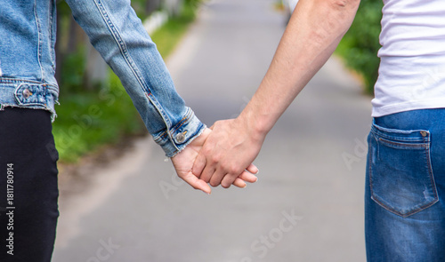 The lovers walk together holding hands. Selective focus.