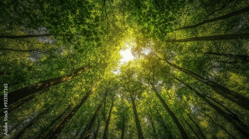 The lush green foliage of a forest reaches for the sky, with tall, slender trees providing a natural frame.