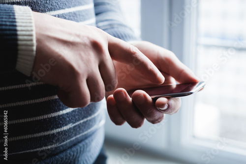 The man is using a smartphone. Modern mobile phone in hand.
