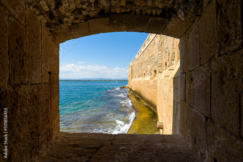 The Maniace Castle in the island of Ortigia. It was built during the Swabian period by Emperor Frederick II of Swabia. It features a decorated portal, arches, towers, a banquet room and a lighthouse.