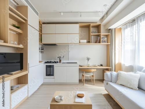 The Modern Apartment Interior Features a Kitchen and Living Area