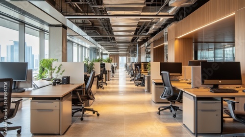 The modern open-plan office with a clean, organized layout. The workspace features rows of individual desks equipped with computers and ergonomic office chairs, separated by privacy screens.