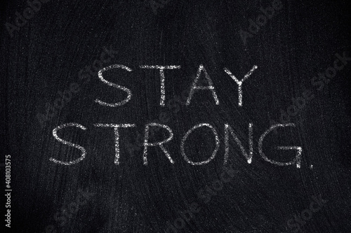 The motivational words Stay Strong, written with white chalk on a rough worn blackboard surface.