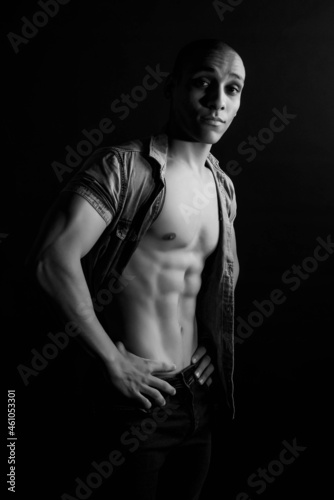 The muscular egyptian male on black background. Sexy naked torso. Sport workout bodybuilding concep. Muscular torso and chest. Isolated on black background.