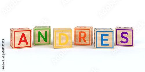 The name andres written with Isolated wooden toy cubes