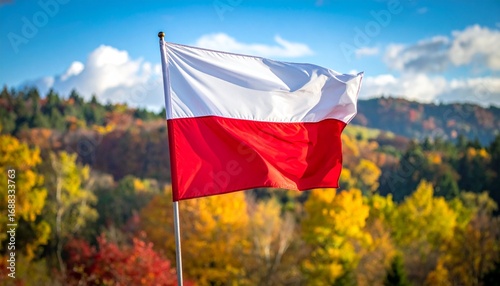 The national flag of Poland waving proudly against a stunning and colorful autumn forest landscape