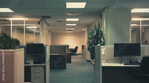 The office workspace is quiet without people. Office interior background.