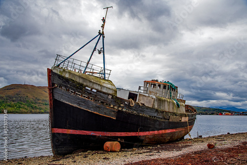 The Old fishing boat on the shingled shoreline of Loch Linnhe near Fort William , Scotland higland, UK
