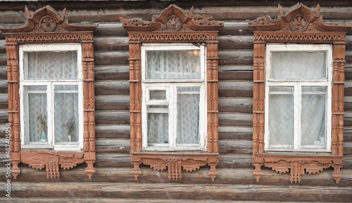 The old window of a rustic Russian wooden house is richly decorated with carvings in an old Russian city.