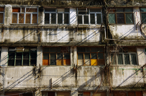 the outer wall of an abandoned old building waiting for redevelopment in Hong Kong