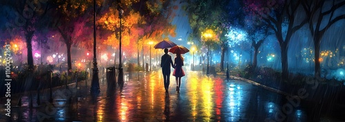 The painting depicts an urban street scene at night, with colorful lights reflecting on the wet pavement and trees in full bloom along both sides of the road