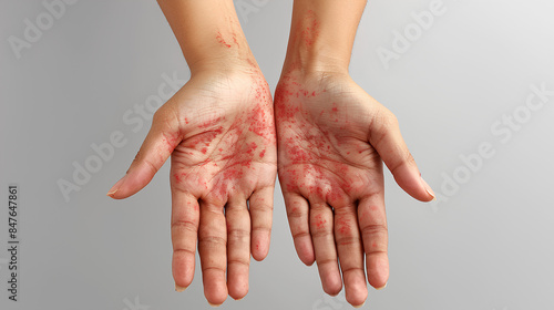 The problem of people is eczema on their hands. White background. A person's skin itches and itches