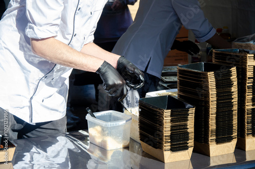 The process of preparing and arranging food in a street kitchen