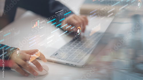 The project manager works and updates tasks with milestones and progress planning. Businessman with Gantt chart scheduling virtual diagram, project management concept