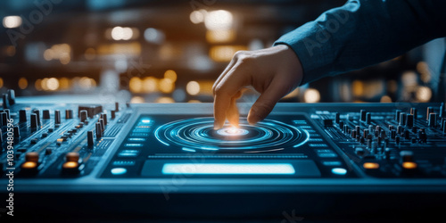 The Pulse of Innovation: A close-up of a hand manipulating a futuristic, glowing digital console, suggesting the control and precision of modern technology.