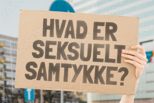 The question " What is sexual consent? " on a banner in men's hands with blurred background. Intimacy. Intimate. Sex. Adult. Law. Relationship. Love. Legality