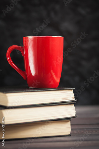The red circle and black books on a dark background