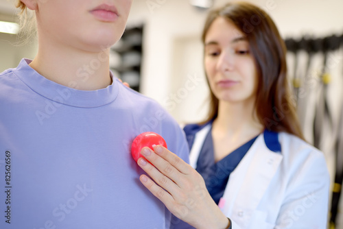 The rehab doctor conducts the patient's appointment in the gym. The PMR specialist trains the patient to perform recovery exercises correctly.