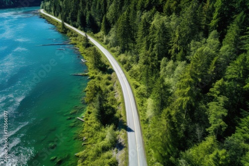 The road along the sea, lake and forest. View from above. A highway in middle of the forest.