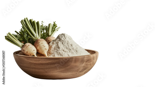 The roots and powder of Asparagus racemosus, or Shatavari, isolated on a white background