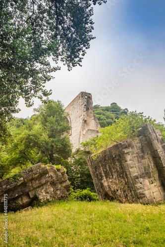 The ruins of the Roman arch bridge of Augustus, in Narni, Terni, Umbria. The remains of the bridge over the Nera river. The big and ancient stone arch, against the blue sky. Trees and dense vegetation