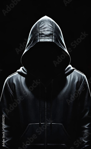 The silhouette of a man with a darkened face in a hood on a black background. Portrait of a murderer, hacker, spy, criminal