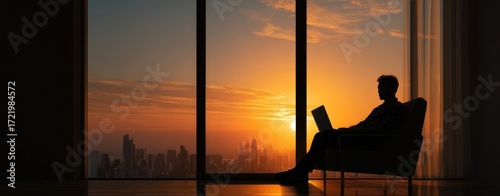 The silhouette of a person working on a laptop during a beautiful sunset.