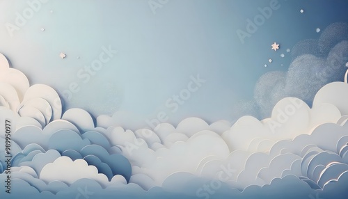 The sky background is filled with pastel fluffy clouds in a paper layer format.