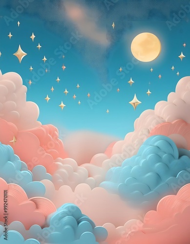 The sky background is filled with pastel fluffy clouds in a paper layer format.