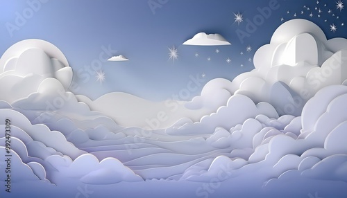 The sky background is filled with pastel fluffy clouds in a paper layer format.