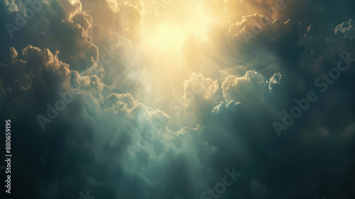 The sky is filled with clouds and the sun is shining through them