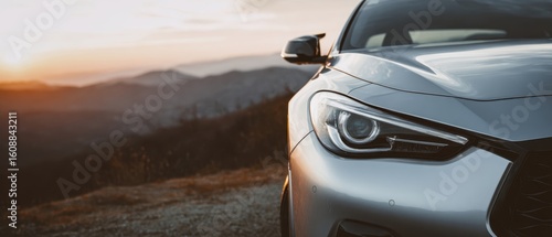 The sleek silver car parked against a breathtaking sunset landscape.