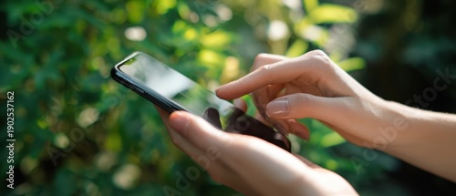 The Smartphone in Hands with Natural Green Bokeh Background and Touch Interaction