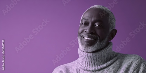 The smiling elderly man wearing a cozy sweater against a vibrant purple background