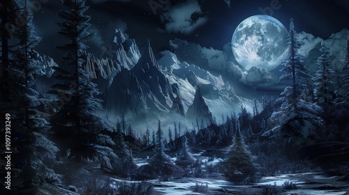 The snow-covered mountain peaks glowed under the soft light of the full moon, casting long, serene shadows across the valley.