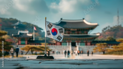 The South Korean flag waves proudly in front of a traditional palace with people walking by.