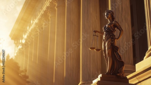 The statue of Lady Justice in front of towering courthouse columns, with sunlight gleaming off her scales