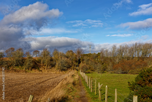 The straight rural footpath between the Angus Village of Friockheim and the settlement of Glasterlaw after crossing the Lunan Water.
