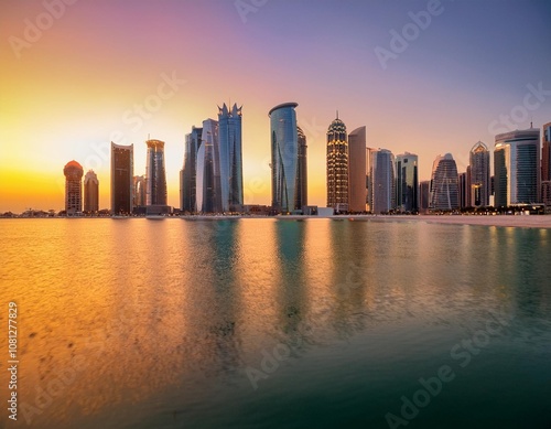 The Stunning Sunset Over Doha’s West Bay Skyline, Where the Glass Skyscrapers Reflect the Fiery Colors of the Arabian Sunset, Blending Modern Architecture With Natural Beauty