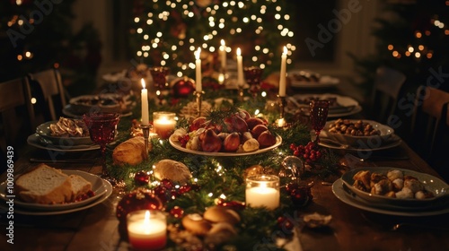 The table is elegantly set for a Christmas celebration, featuring delicious dishes, sparkling candles, and festive decorations, creating a warm holiday atmosphere